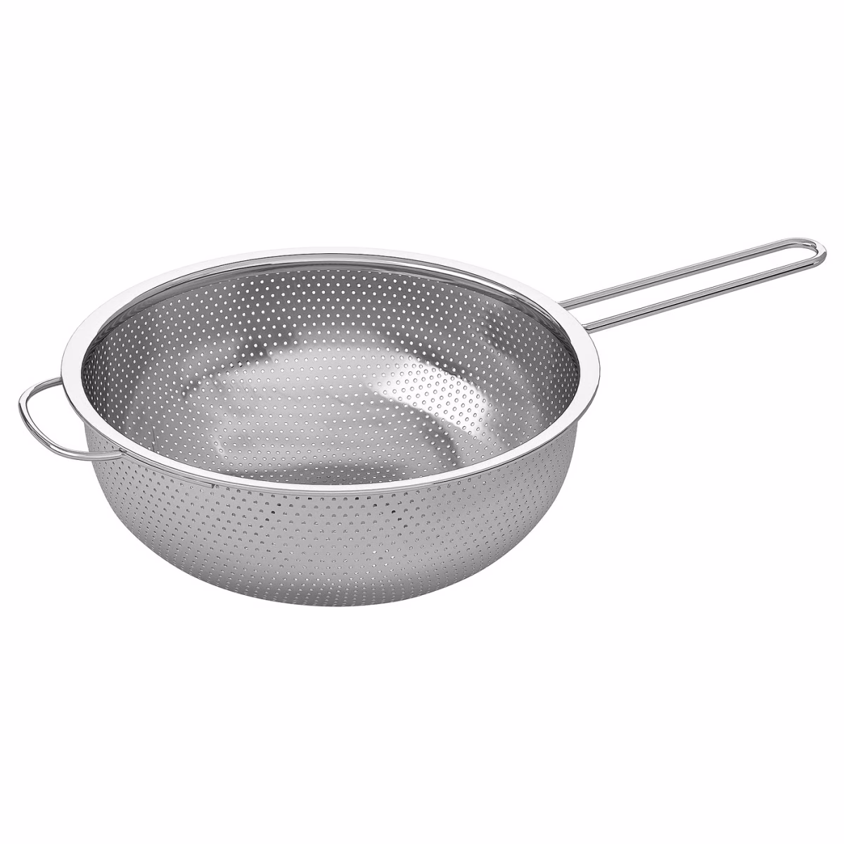 I joke that “friends don’t let friends buy Ikea”, but I have plenty of exceptions. Ikea’s stainless steel collanders fit perfectly across my main sink’s tier lip, are extremely light, and are machine washable. I bought two and they’re so often in simultaneous use I bought a third. After 3 years of very heavy use the handle broke off one, but at $10, I still recommend it.